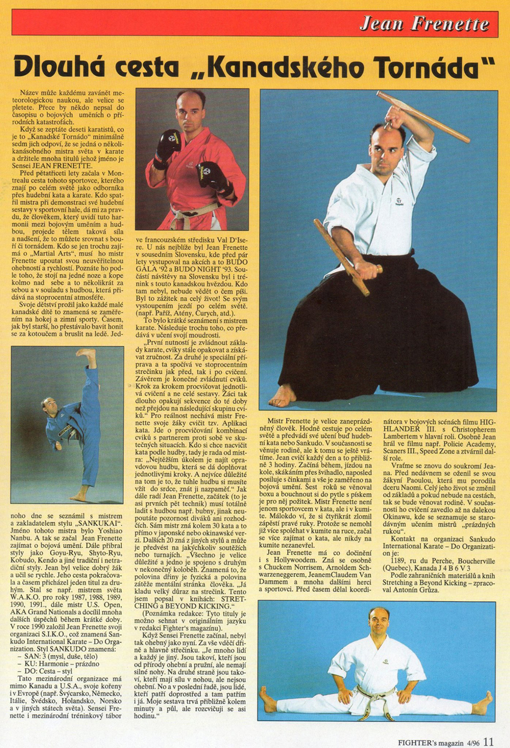 Se spoluprací jsem začal už od samotného vzniku časopisu, ale první text mi byl uveřejněn v čísle 4 (prosinec 1996 – leden 1997). Nesl název Dlouhá cesta „Kanadského tornáda“. Název může na první pohled zavánět meteorologií, ale mýlíte se. Přeci by přece nikdo nepsal do časopisu o bojových uměních o přírodních katastrofách. Když se zeptáte deseti karatistů, co je to „Kanadské tornádo“, minimálně sedm z nich odpoví, že jde o několikanásobného mistra světa v karate a držitele mnoha titulů, jehož jméno je sensei Jean Frenette.